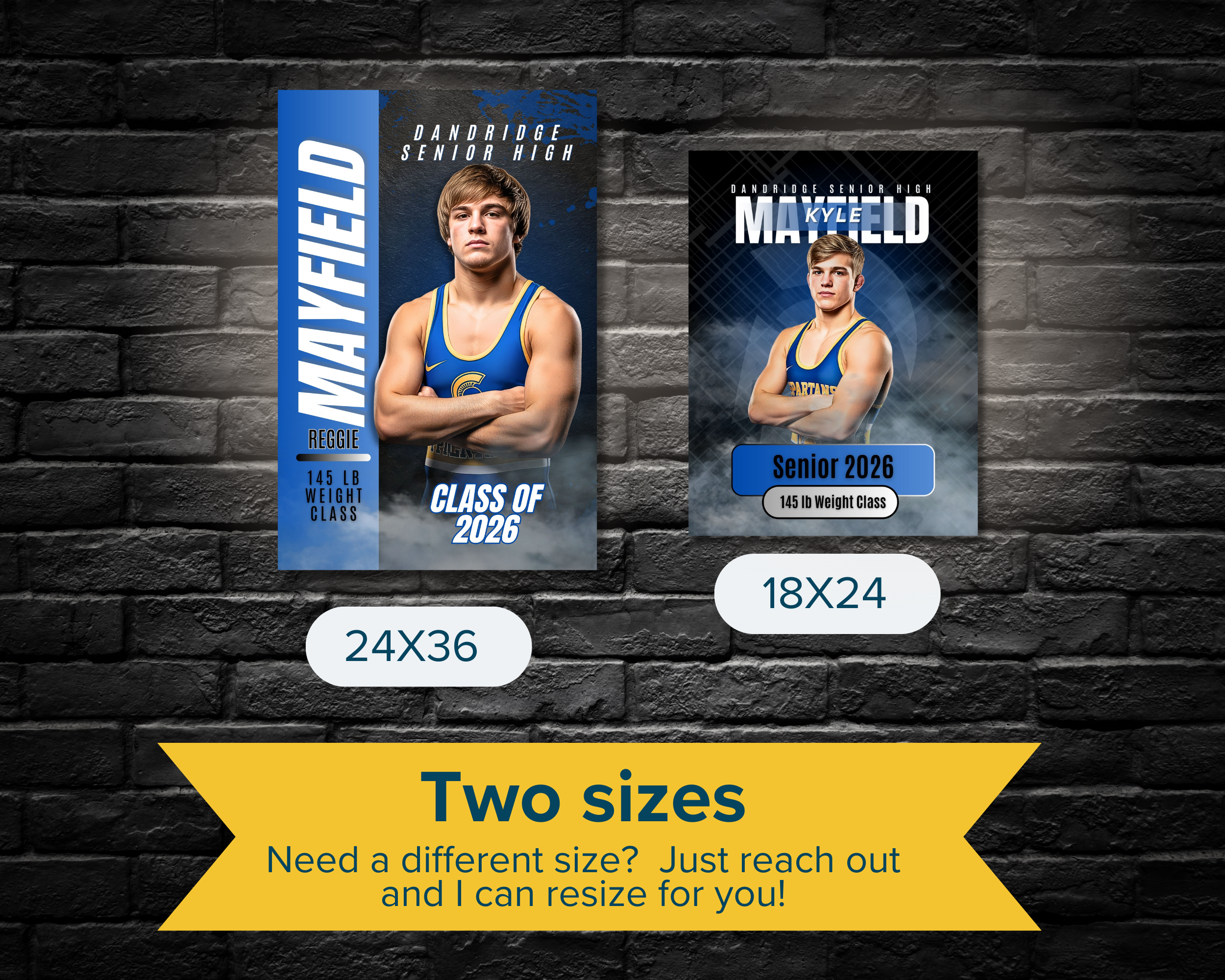 Celebrate your wrestler in a big way with this Wrestling Senior Night poster template editable in Canva. Easily change the name, school, colors, and weight class to match your team, then download a high-resolution file for printing as a senior poster or wrestling banner. Perfect for Senior Night, pep rallies, and end-of-season gifts.